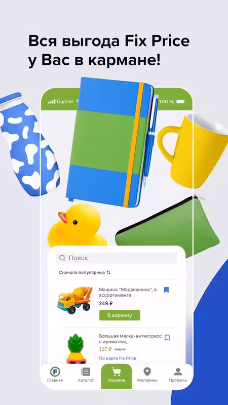 Скачав приложение Fix Price, вы сможете делать покупки в любом месте и в любое время. Это особенно удобно, если вам нужно быстро найти что-то в магазине, но вы не хотите терять время на поиск. Все товары представлены в каталогах, и вы можете добавить их в корзину, не выходя из дома.